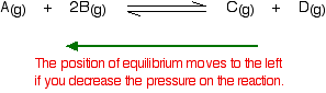 Using Le Chatelier's Principle with a change of pressure This only applies to reactions involving gases: What would happen if you changed the conditions by increasing the pressure? According to Le Chatelier, the position of equilibrium will move in such a way as to counteract the change. That means that the position of equilibrium will move so that the pressure is reduced again. Pressure is caused by gas molecules hitting the sides of their container. The more molecules you have in the container, the higher the pressure will be. The system can reduce the pressure by reacting in such a way as to produce fewer molecules. In this case, there are 3 molecules on the left-hand side of the equation, but only 2 on the right. By forming more C and D, the system causes the pressure to reduce. Increasing the pressure on a gas reaction shifts the position of equilibrium towards the side with fewer molecules. The equilibrium will move in such a way that the pressure increases again. It can do that by producing more molecules. In this case, the position of equilibrium will move towards the left-hand side of the reaction. In this case, increasing the pressure has no effect whatsoever on the position of the equilibrium. Because you have the same numbers of molecules on both sides, the equilibrium can't move in any way that will reduce the pressure again. Important Again, this isn't an explanation of why the position of equilibrium moves in the ways described. You will find a rather mathematical treatment of the explanation by following the link below. | |